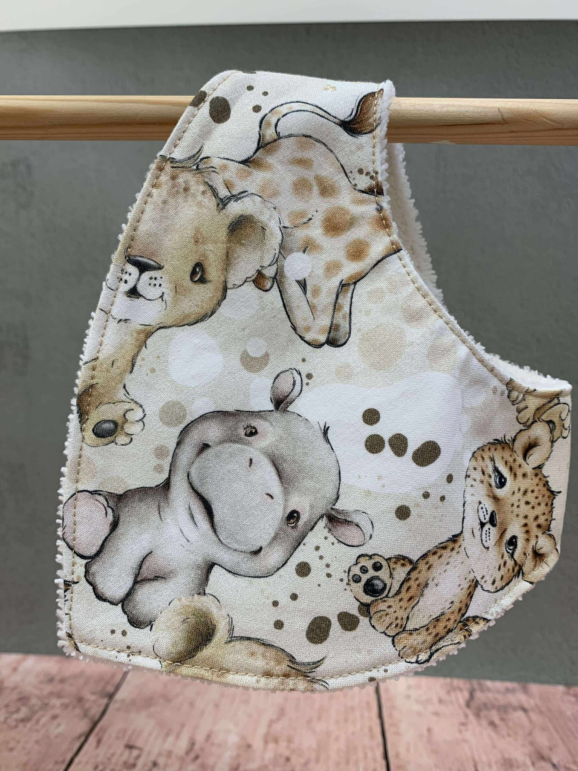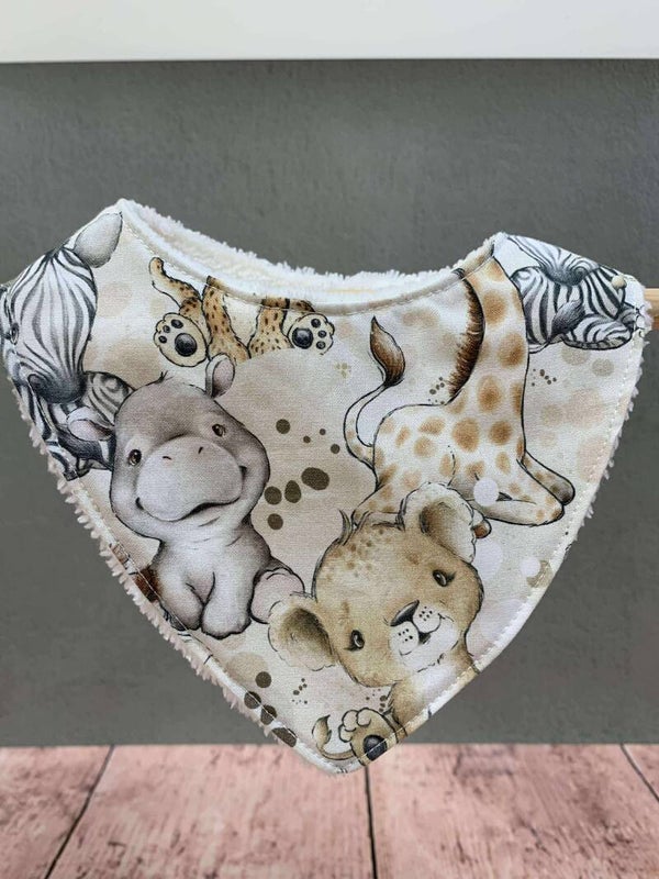 Chaque bandana est unique : selon la découpe du tissu, les animaux présents peuvent varier (girafe, zèbre, hippopotame…). Le motif est donc aléatoire.