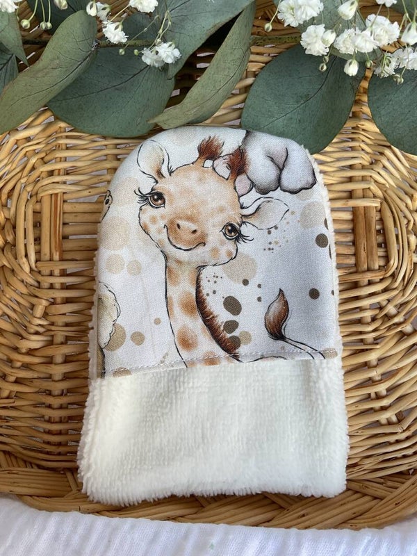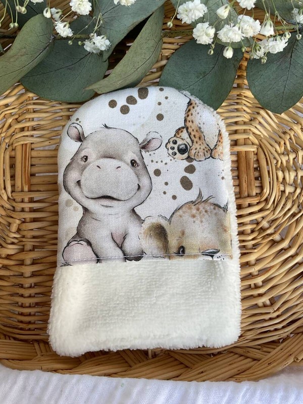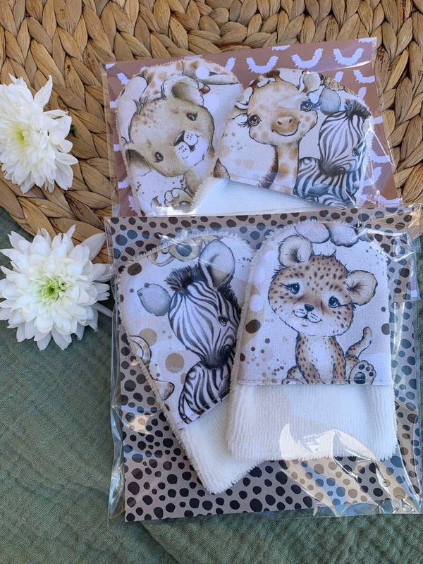 Les gants sont disponibles en 2 tailles, taille 1 pour les moins de trois ans et taille 2 pour les plus grands. Les animaux présents sur le gants de toilettes serons répartis aléatoirement selon le stock. Si vous avez une préférence vous pouvez le préciser en commentaire.