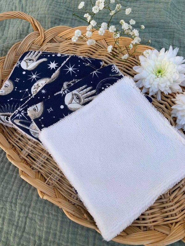 Chaque coton est composé d’une face en tissu éponge bambou pour un nettoyage en douceur, et d’une face en coton imprimé, aux motifs délicats qui ajoutent une touche de poésie à votre routine.