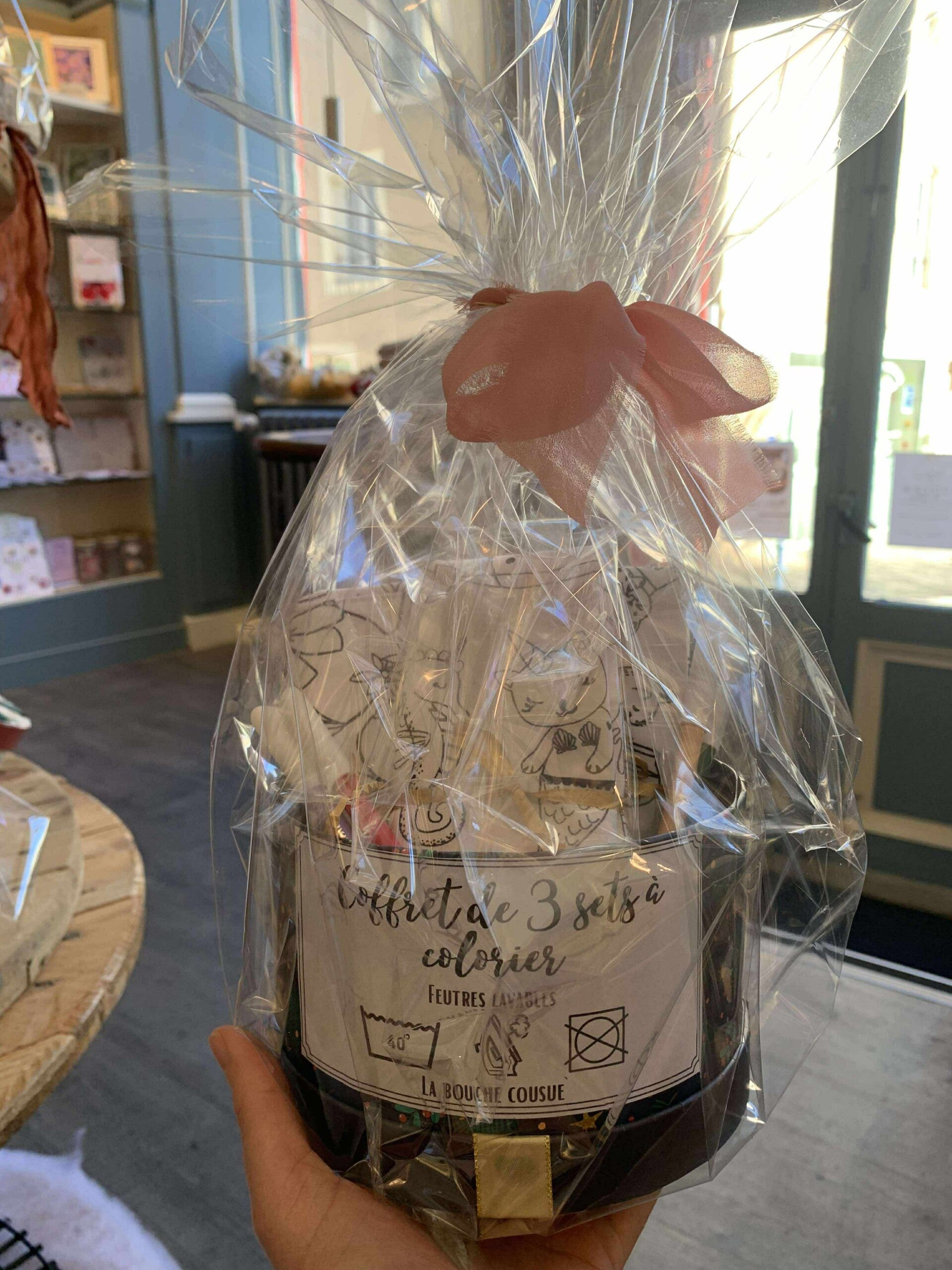 Chaque coffret contient 3 sets en tissu réutilisables 🌈 et des feutres adaptés aux petites mains 🖍️ le tout dans une jolie boîte de Noël 🎄
